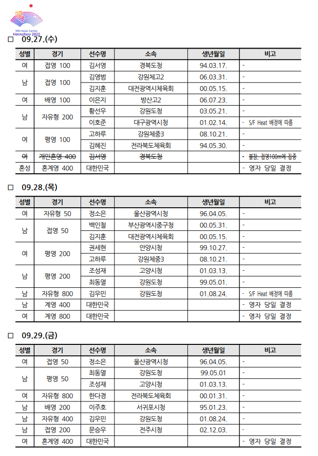 제19회 항저우 하계 아시아 경기대회_수구/ 아티스틱스위밍/ 오픈워터스위밍 일정공지 (0) | 2023.09.20 |