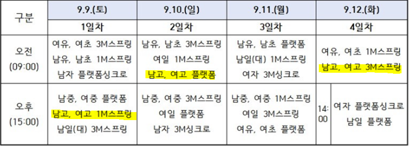 - 여자(고등 - 일반) 싱크로 다이빙에서 모든 종목을 수행 할 시 반드시 5개의 그룹이